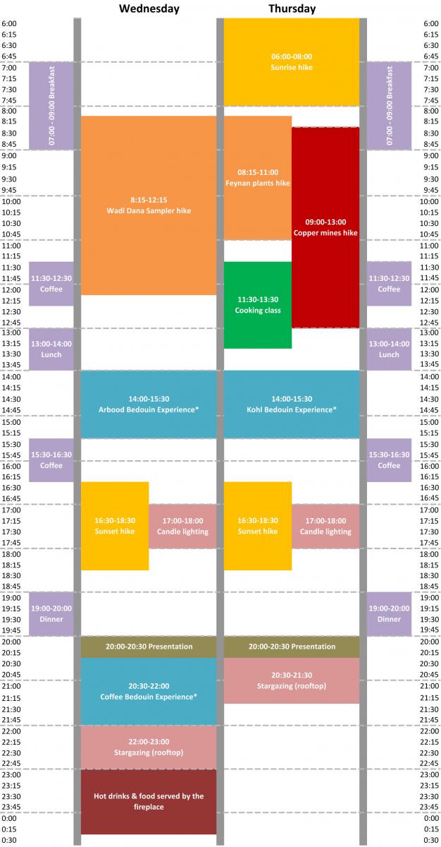تحقق من برامج النشاطات لهذا اليوم في الجدول أدناه. جميع النشاطات بمرافقة أحد أدلائنا ومشمولة في سعر إقامتك. توجد مبالغ تكميلية بسيطة للنشاطات التي تتم بمشاركة المجتمع المحلي. وتذهب هذه المبالغ مباشرة إلى العائلة التي استضافتك. الدراجات الجبلية وخبرة يوم مع الراعي متوفرة يوميا!